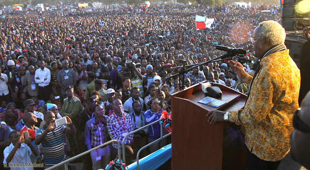 Mgombea Urais wa Tanzania wa UKAWA kupitia Chama cha Demokrasia na Maendeleo (CHADEMA), Mh. Edward Lowassa, akiwa kwenye gari lake la wazi huku umati wa wananchi wa Dodoma ukimsindikiza wakati akitokea kwenye Mkutano wa Kampeni uliofanyika leo kwenye Uwanja wa Barafu, Mjini Dodoma leo Septemba 11, 2015.